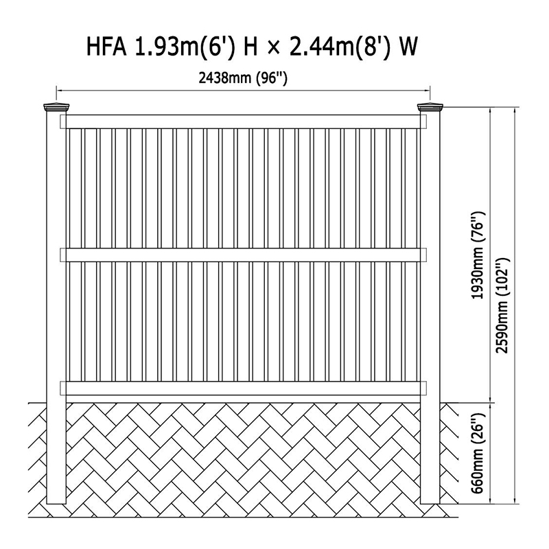 A 72 hüvelyk standard magasságban állva, testreszabható lehetőségekkel a különböző magasságokhoz, a kerítés meghívó akadályt hoz létre, miközben lehetővé teszi a fény és a levegő átjutását. Minden panelnek a szokásos szélessége 96 hüvelyk, de különféle szélességi lehetőségeket is kínálunk, amelyek megfelelnek az egyedi igényeinek.